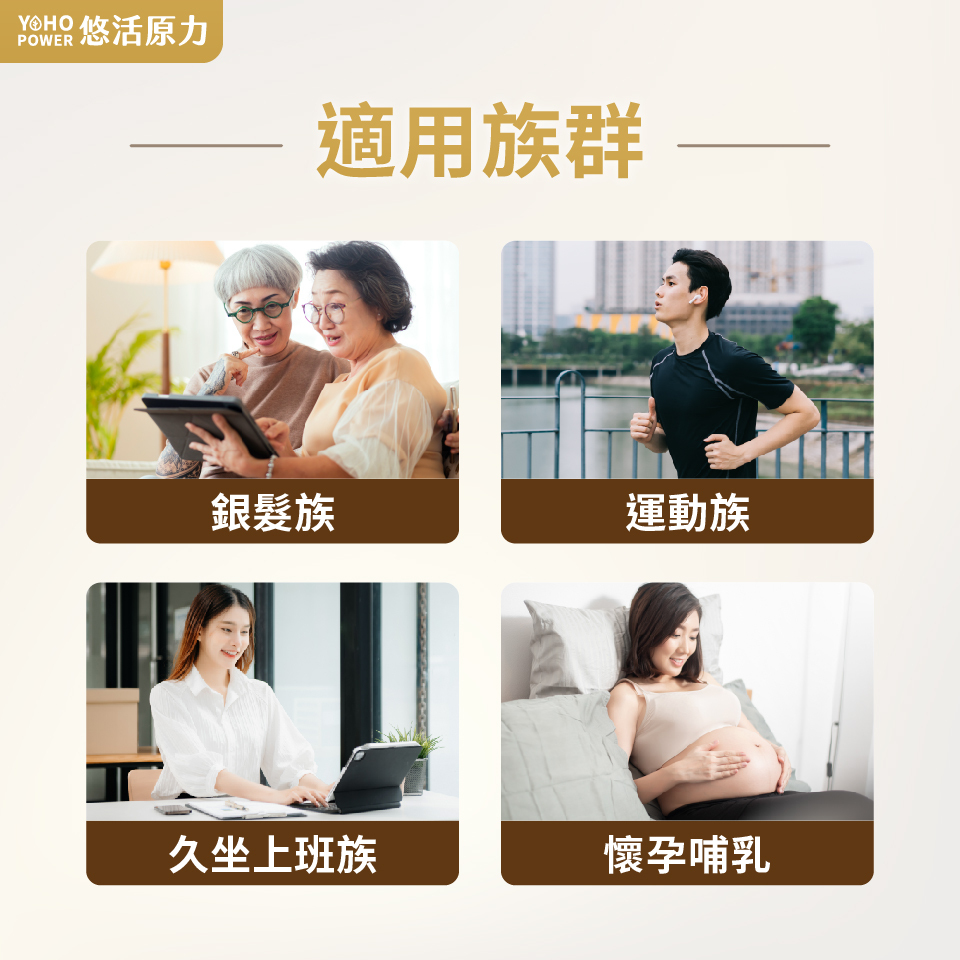 A:銀髮族、運動族、久坐上班族、懷孕哺乳媽媽都可適量補充。
