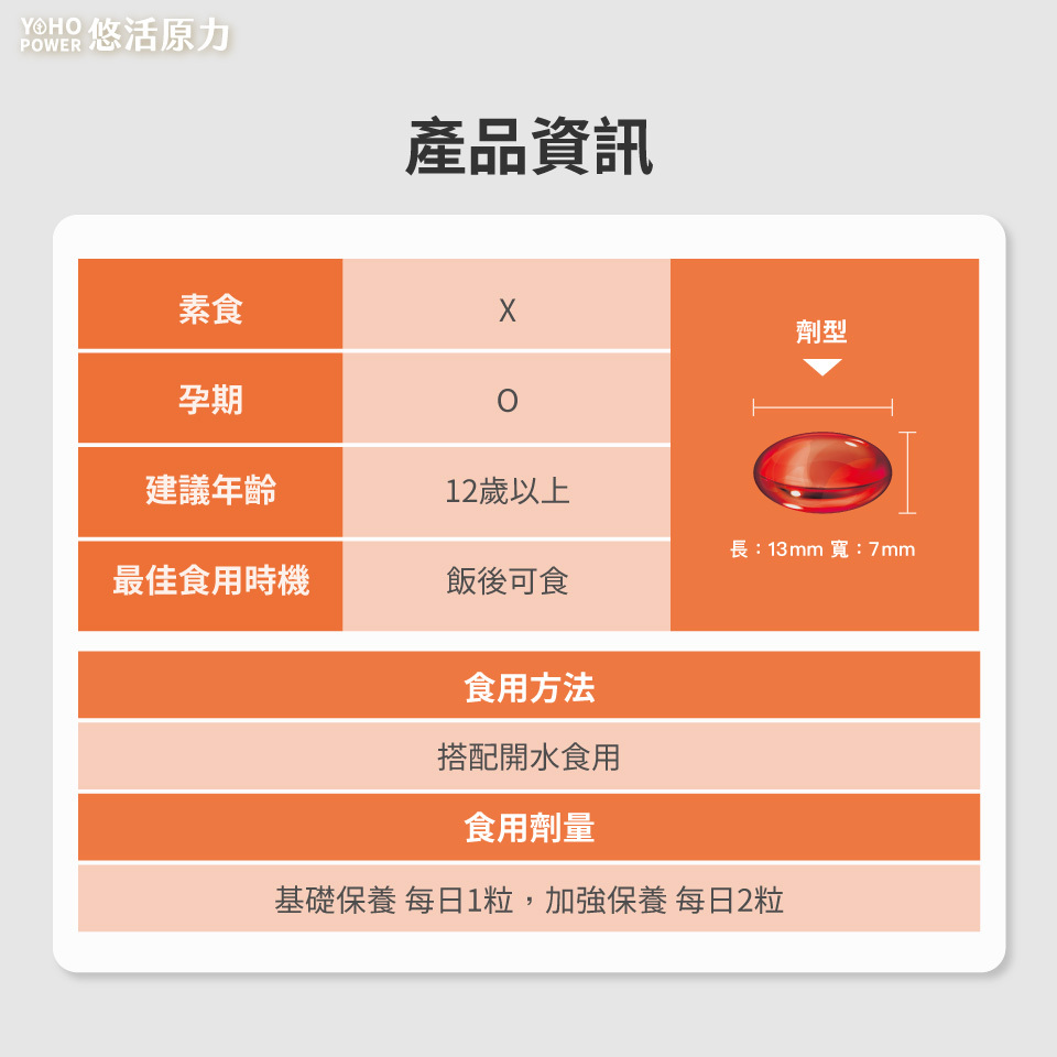 A:依個人需求搭配食用。魚油+磷蝦油能提高魚油吸收率,如需攝取更多EPA+DHA,可再搭配一顆悠活深海黃金魚油,達到高濃度、高吸收率。