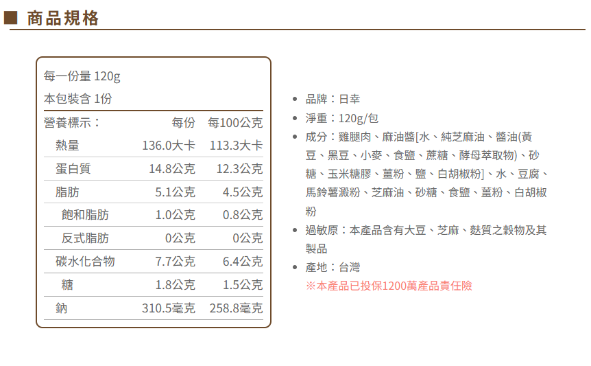 ※過敏原:本產品含有大豆、芝麻、麩質之穀物及其製品