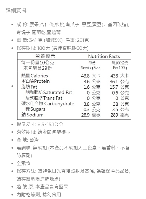 除了多種原味低溫烘焙堅果,搭配養生黑豆,黃豆,再加上三種鮮甜果乾,融合堅果與果乾及果仁的豐富滋味,一口吃到多樣化的健康美味,絕對是能讓適合全家大小品嚐的最佳零嘴。