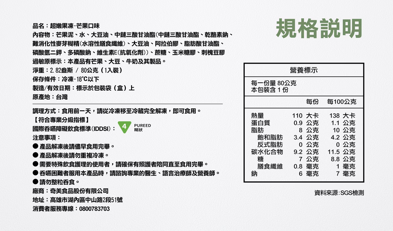 「好吞嚥超嫩水果凍」營養師精心設計,每杯80公克 . 總熱量約為100大卡,總醣(糖)量15~20公克,約一份碳水化合物,若有嚴格血糖控制者,建議食用前請教專業營養師。