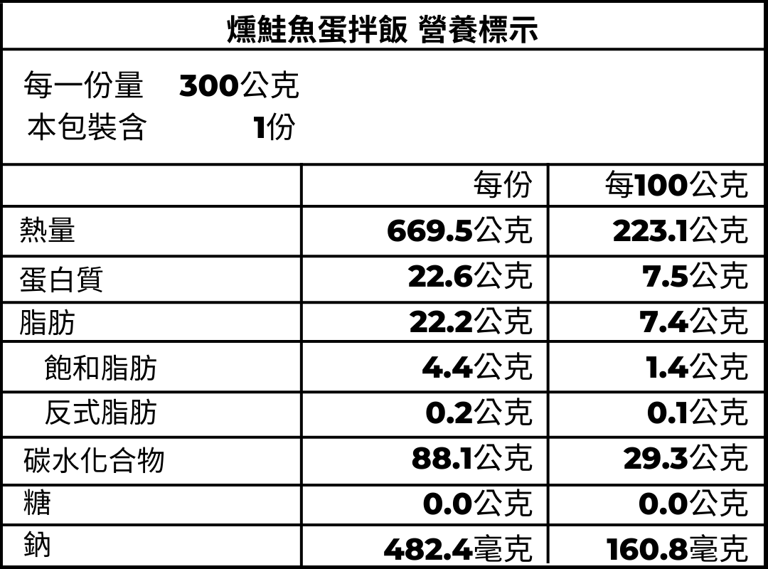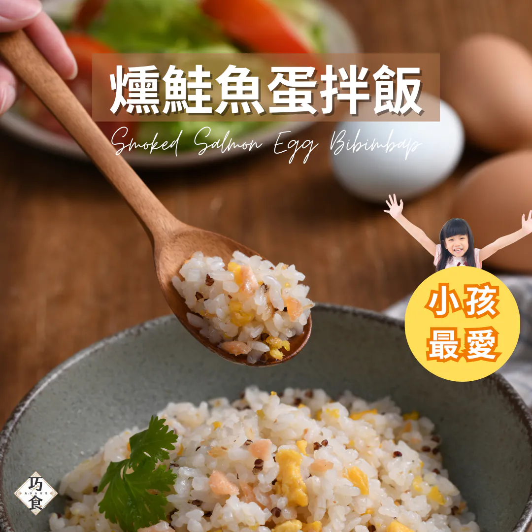 台灣冠軍越光米、紅藜麥、燻鮭魚(鮭魚、鹽、糖)、自煉豬油、台灣檢驗合格雞蛋、紅蔥頭、鹽、蒜