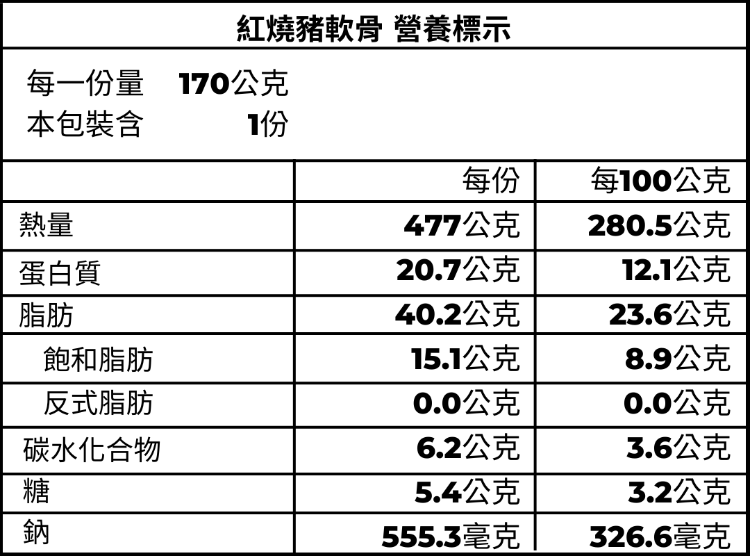 國產可溯源檢驗合格豬肉、過濾水、古法釀造醬油(黑豆、水、鹽、糖、甘草)、糖、洋蔥、蔥、薑、米酒(蓬萊米、水、精製食用酒精)、香油(大豆沙拉油、芝麻油)