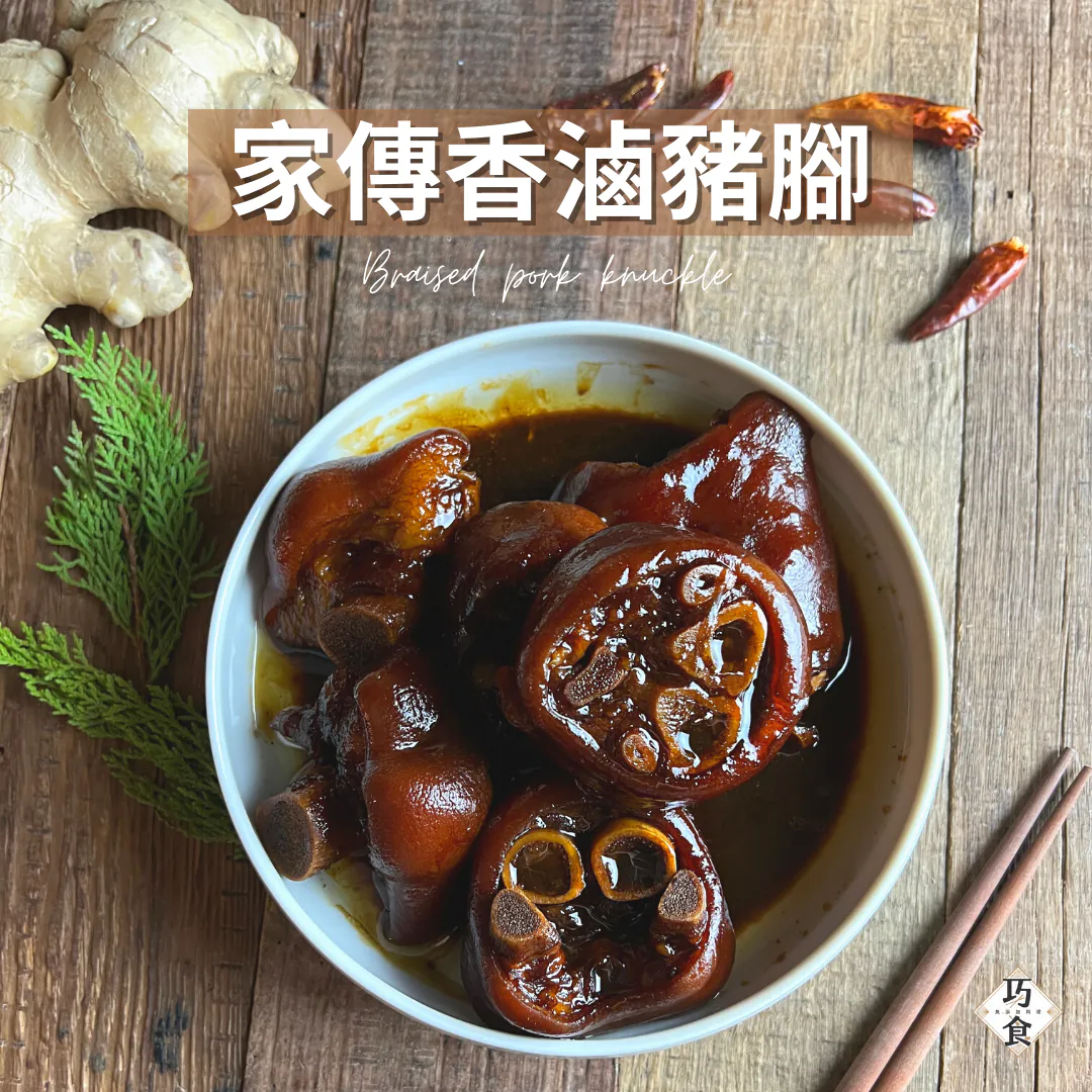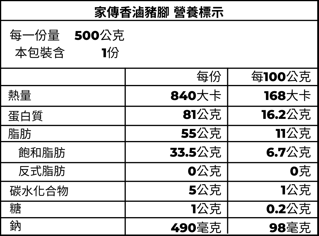 國產可溯源檢驗合格豬腳、過濾水、古法釀造醬油(黑豆、水、鹽、糖、甘草)、糖、洋蔥、薑、米酒(蓬萊米、水、精製食用酒精)、鹽巴