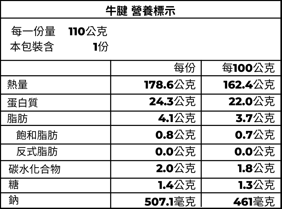 美國牛腱心、過濾水、古法釀造醬油(黑豆、水、鹽、糖、甘草)、洋蔥(滷製後已剔除)、紅蘿蔔(滷製後已剔除)、滷包(八角、肉桂、草果,滷製後已剔除) 醬料包(蒜苗、醬油膏(水、黑豆、蔗糖、鹽、糯米、甘草、酵母抽出物)、烏醋(水、釀造米酢、糖、鹽、胡蘿蔔汁、洋蔥汁、番茄汁、柳橙汁、焦糖色素、香料)、香油(大豆沙拉油、芝麻油)) (本產品含有黃豆、黑豆、大豆、芝麻其製品,不適合對其過敏體質者食用)