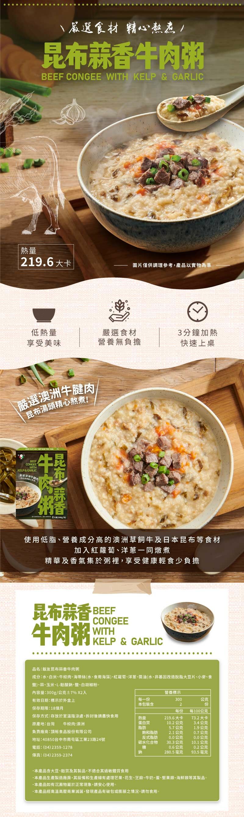 成分:水、白米、牛絞肉、海帶絲(水、食用海藻)、紅蘿蔔、洋蔥、醬油(水、非基因改造脫脂大豆片、小麥、食鹽)、蒜、玉米 、L-麩酸鈉、鹽、白胡椒粉。