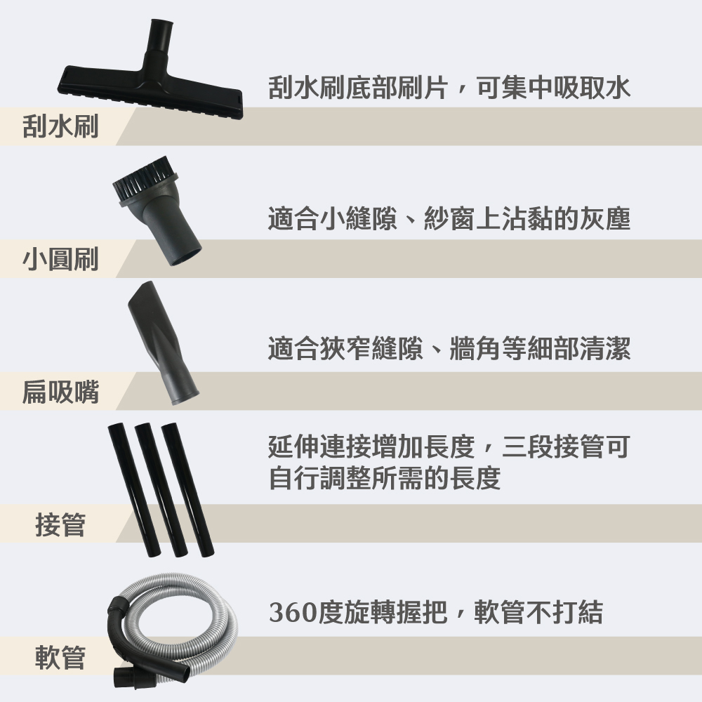 內容 : 主機、刮水刷、小圓刷、扁吸嘴、接管x3、軟管