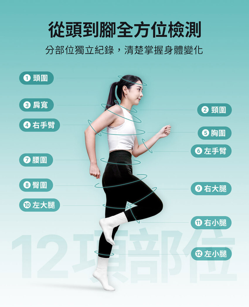 ❶ 12 項獨立測量部位,從頭到腳全方位檢測