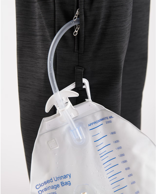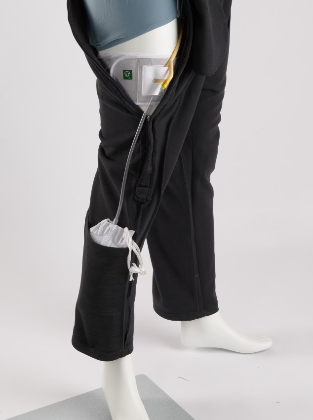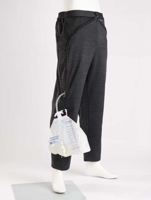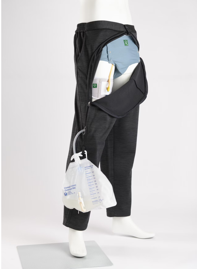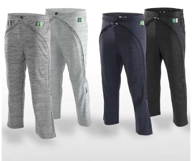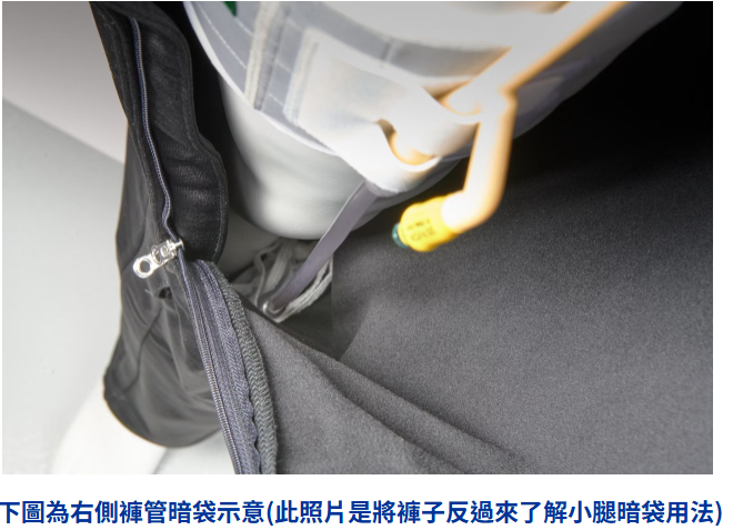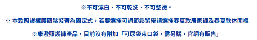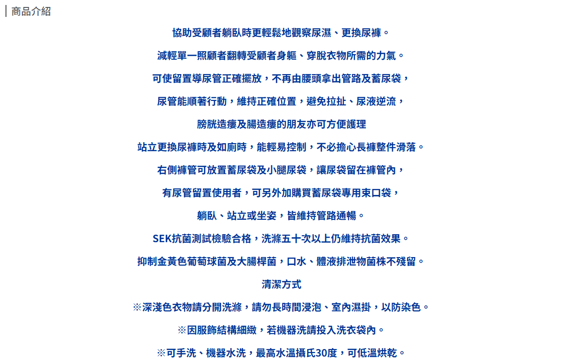 特色 :前腹部雙弧型三頭拉鍊專利設計,延伸至左右膝部,容易穿脫、方便觀察尿濕、尿管護理、男性尿壺操作、穩定續尿管,右側褲管暗袋可放置男性用尿套袋、小腿尿袋、尿排空之大尿袋 。