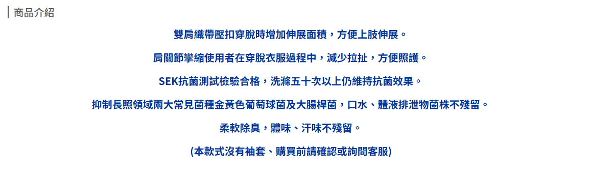 特色 : 雙肩部織帶壓扣,單側拉鍊,容易穿脫。