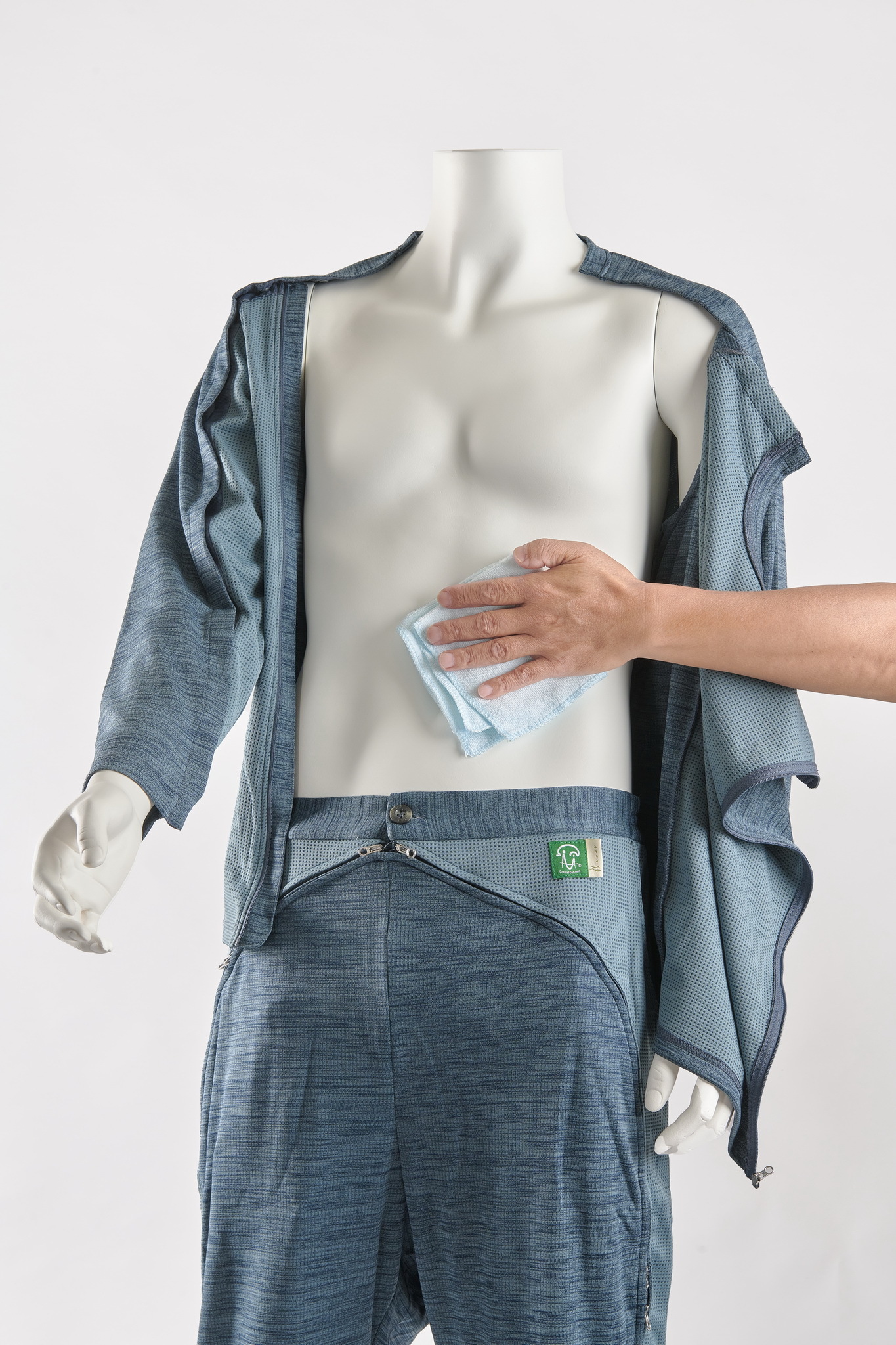 肩頸至袖口織帶壓釦專利設計、及衣身單側拉鍊,讓衣身能完全展開、穿戴後保留優雅外觀。