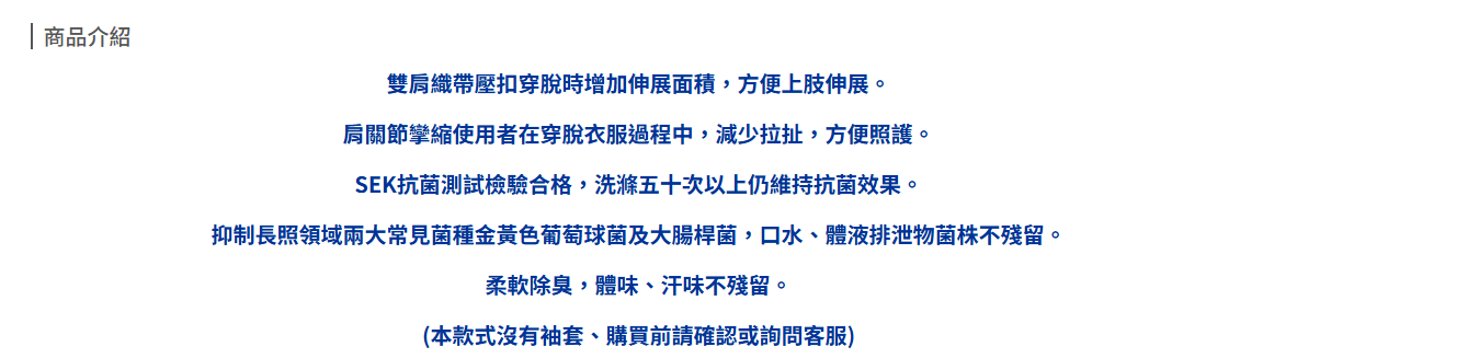 特色 : 雙肩部織帶壓扣,單側拉鍊,容易穿脫。