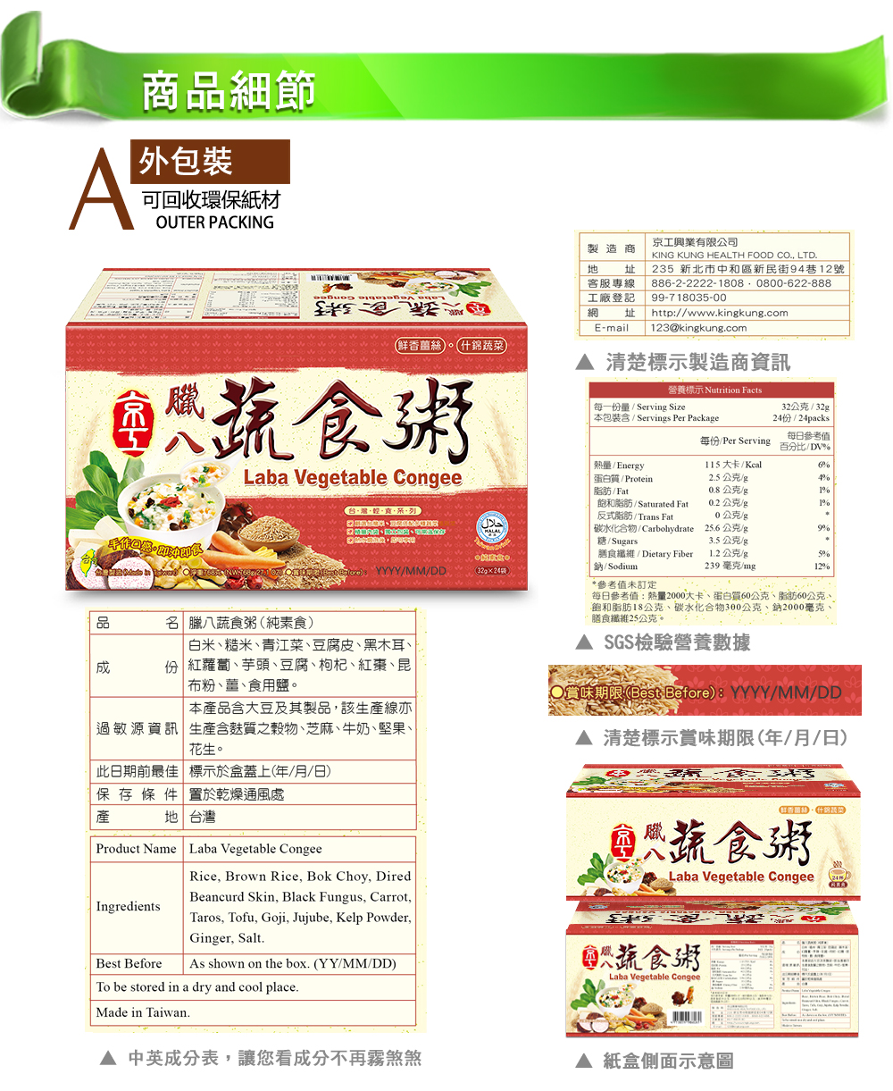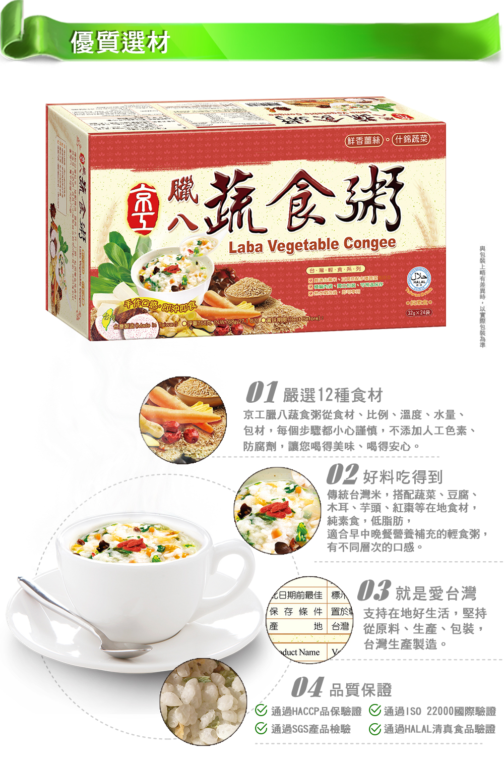♦ 傳統台灣糙米,搭配蔬菜、豆腐、木耳、芋頭、紅棗等在地食材,純素食,低脂肪,適合早中晚餐營養補充的輕食粥,沖泡後鮮香可口,有不同層次的口感。