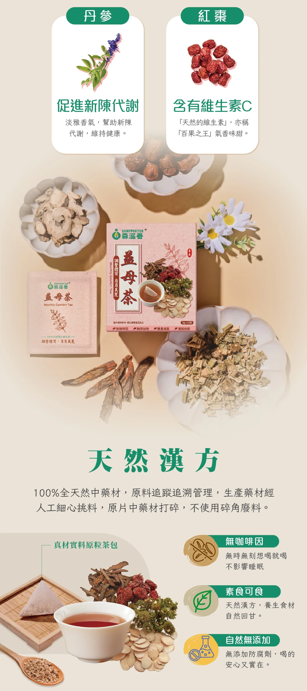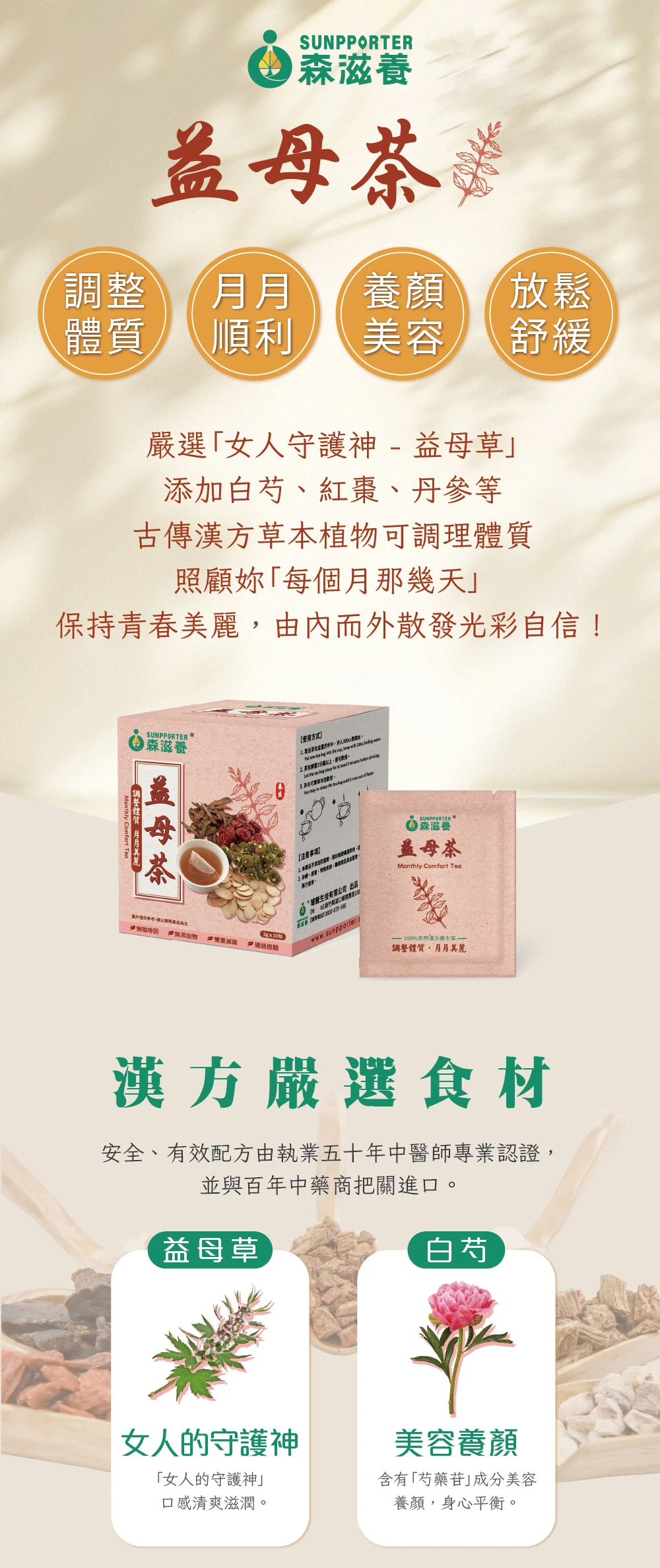 嚴選「女人守護神 - 益母草」添加白芍、紅棗、丹參等古傳漢方草本植物,可調理體質,照顧妳「每個月那幾天」,保持青春美麗,由內而外散發光彩自信!