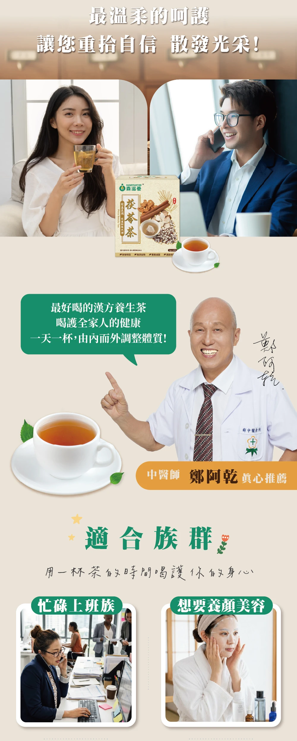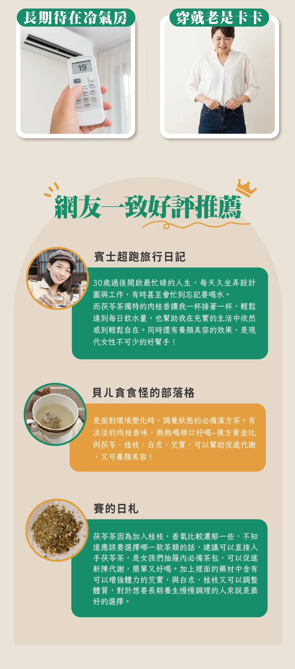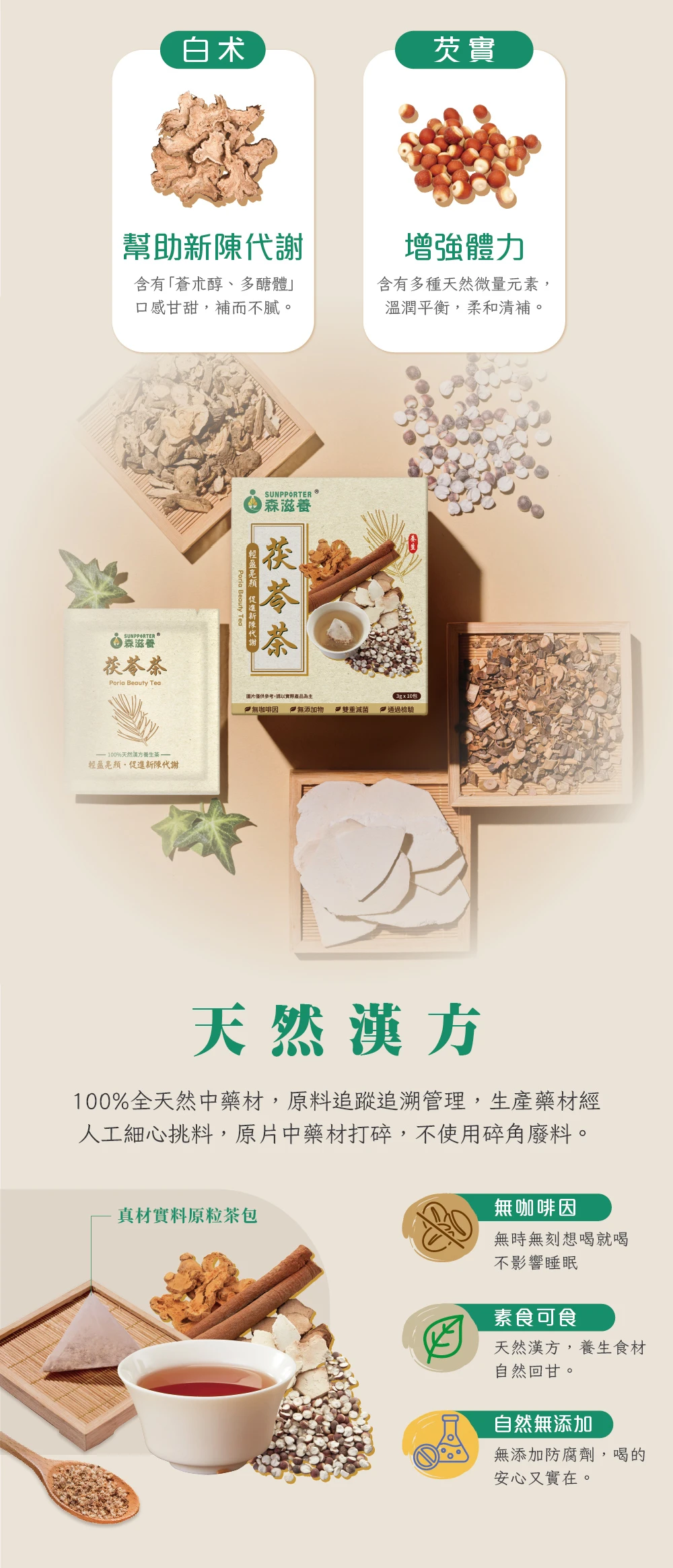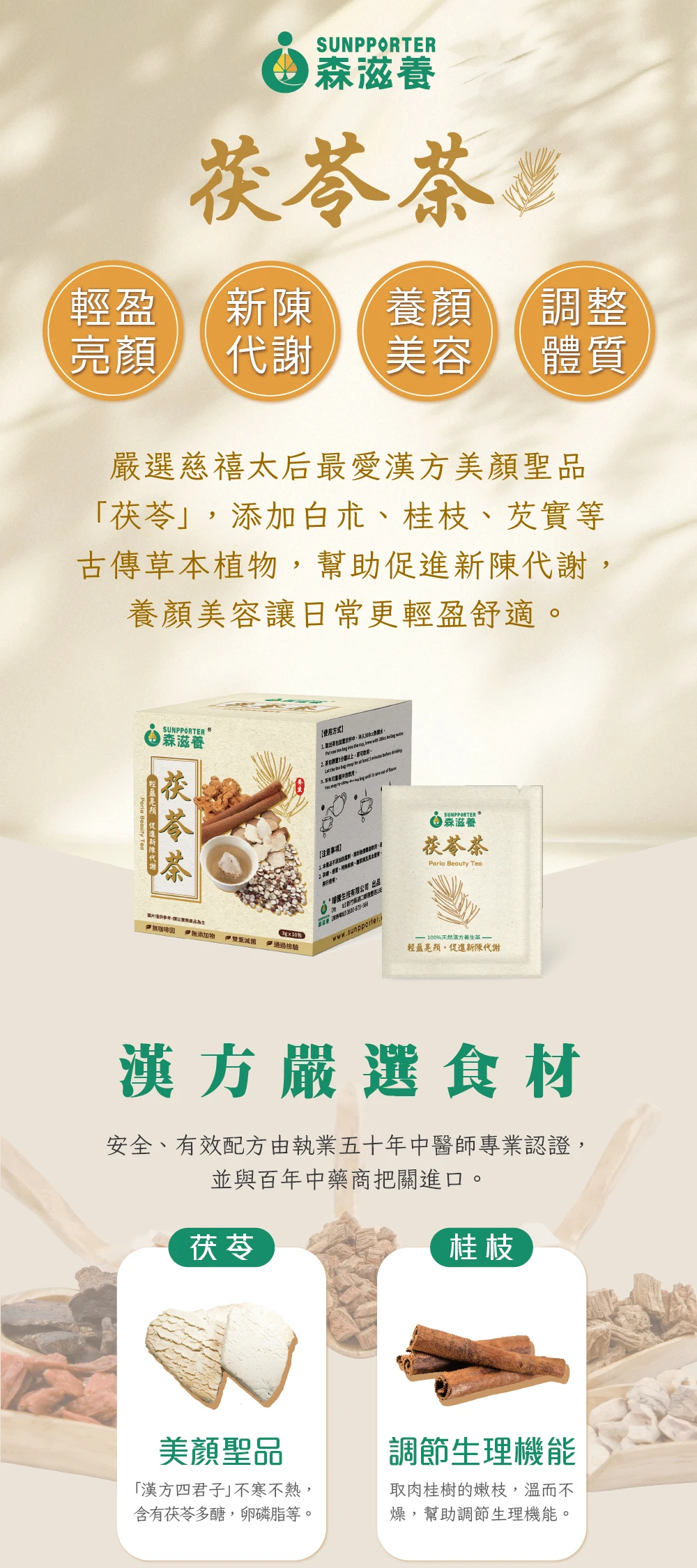 嚴選慈禧太后最愛的漢方美顏聖品 「茯苓」,添加肉桂、白朮、芡實等古傳草本植物,幫助促進新陳代謝、養顏美容,讓日常更輕盈舒適。