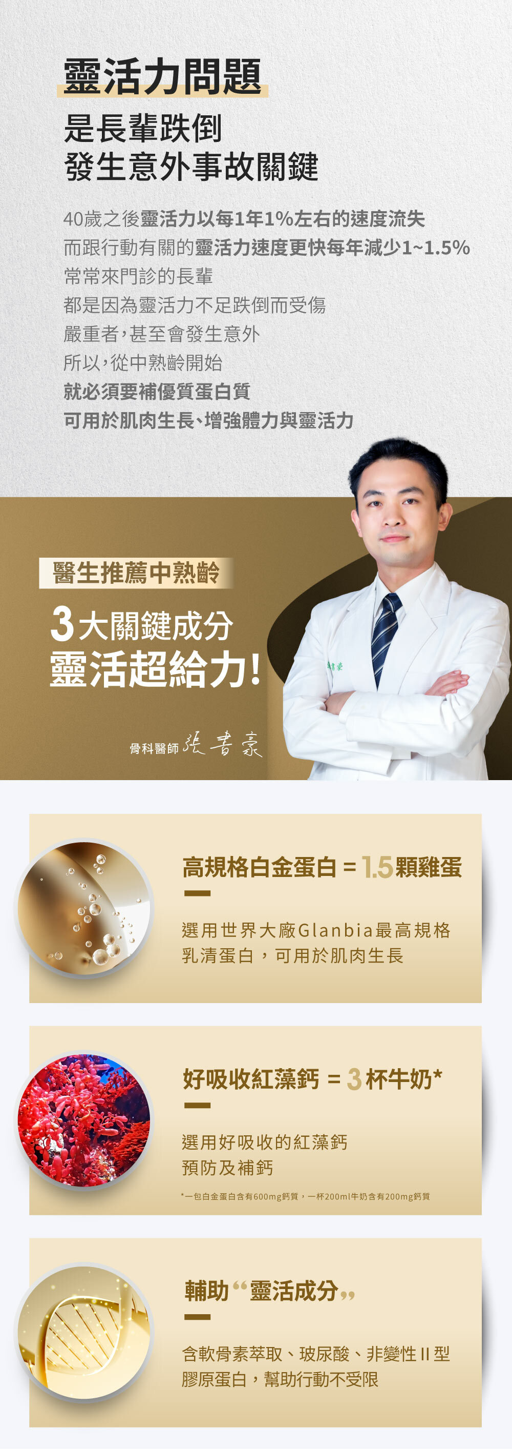 ●行動力UP-強化肌力的【BCAA】及【軟骨素萃取】【紅藻鈣】對骨骼最有幫助的成份都足量添加!