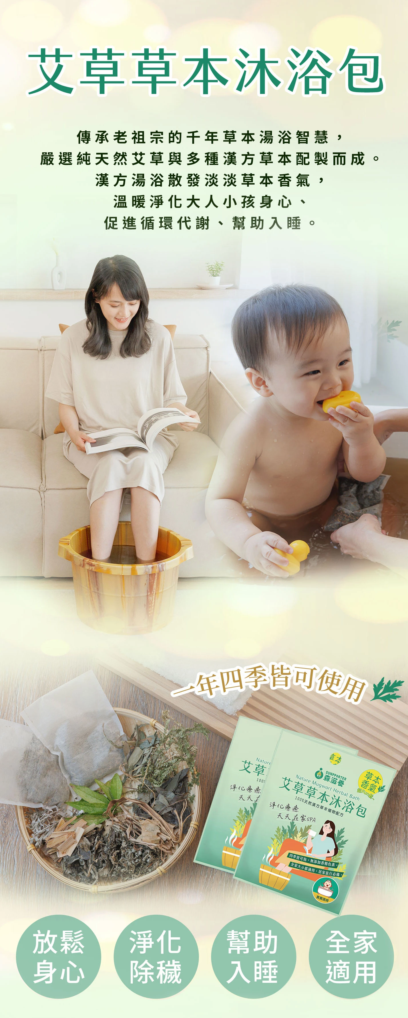 傳承老祖宗的千年草本湯浴智慧,嚴選純天然艾草與多種漢方草本配製而成。漢方湯浴散發淡淡草本香氣,溫暖淨化大人小孩身心、促進循環代謝、幫助入睡,在家就能來場放鬆SPA~