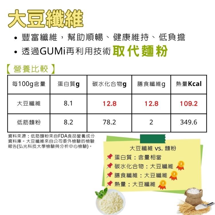 ●大豆纖維取代麵粉,1包含7.2g大豆纖維