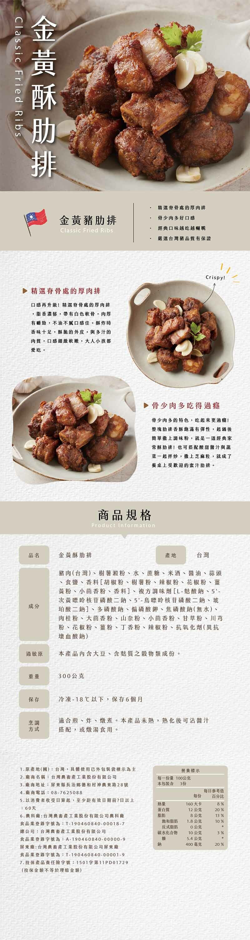口感再升級! 精選脊骨處的厚肉排,脂香濃郁,帶有白色軟骨,酥炸時肉骨香味十足,酥脆的外皮,與多汁的肉質,口感細緻軟嫩。骨少肉多的特色,吃起來更過癮! 整塊肋排香酥飽滿有彈性,起鍋後簡單撒上調味粉,就是一道經典家常酥肋排! 也可搭配酸甜醬汁與蔬菜一起拌炒,撒上芝麻粒,就成了餐桌上受歡迎的蜜汁肋排。