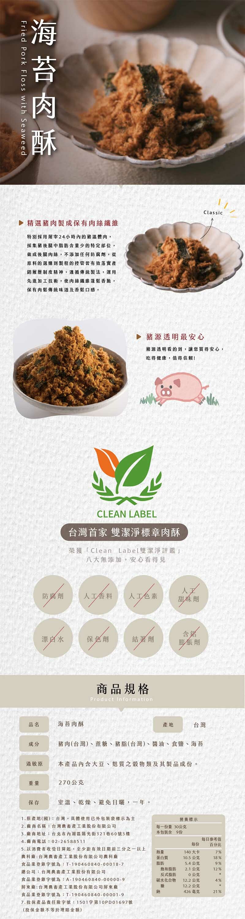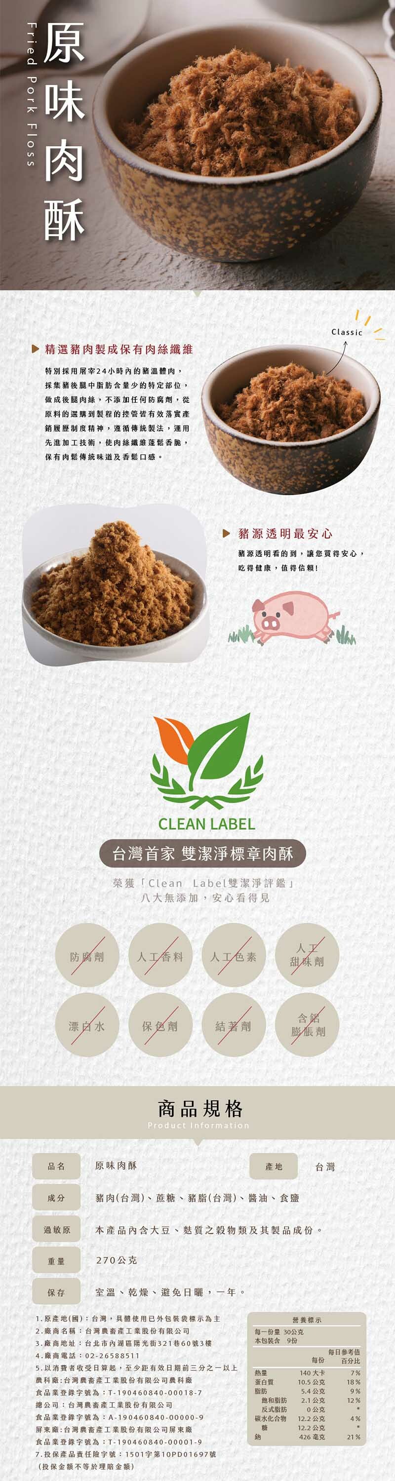 台畜原味肉酥為CAS認證的優良肉品,為潔淨標示最佳代表,讓您吃得安心、選購放心。