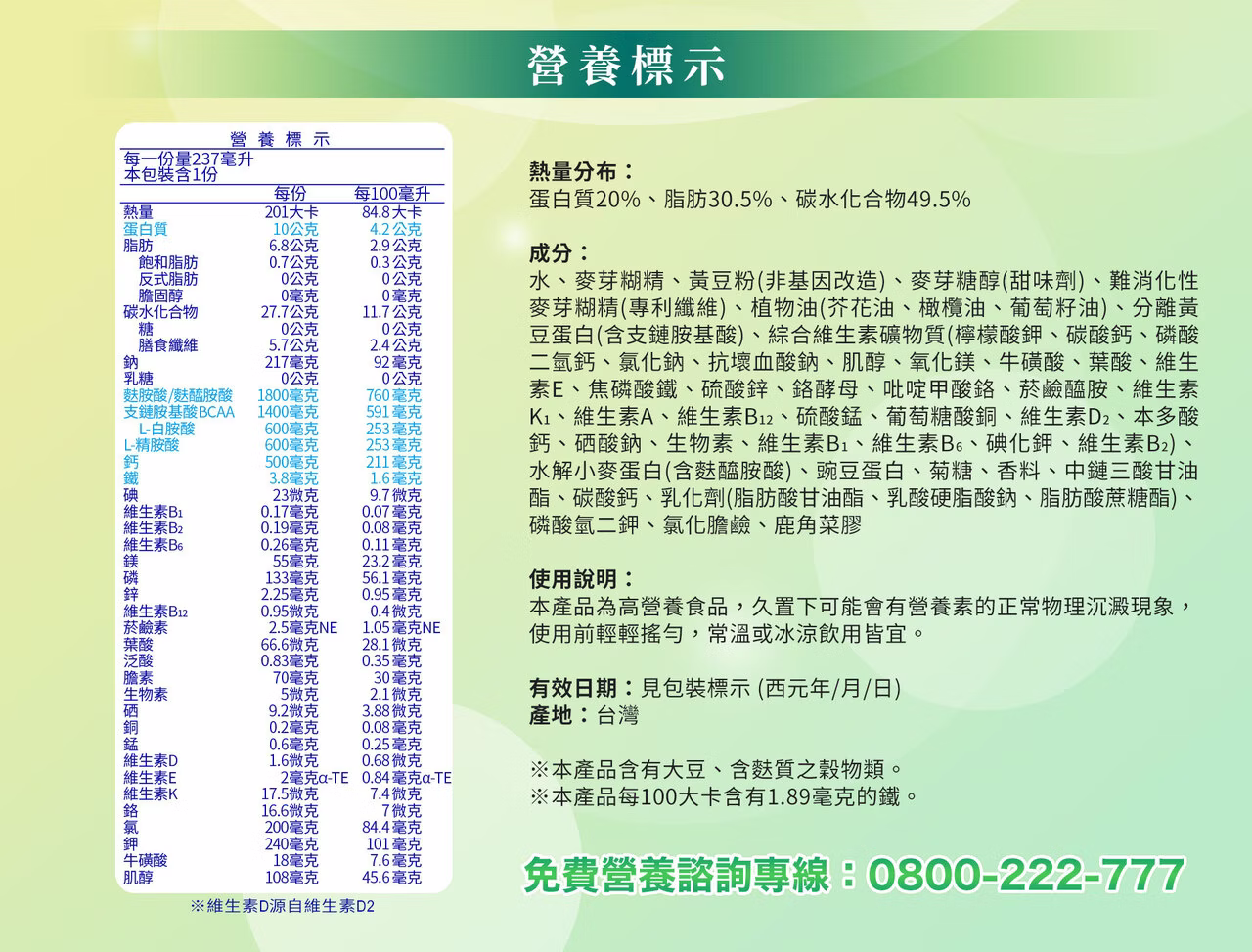 水、麥芽糊精、黃豆粉(非基因改造)、麥芽糖醇(甜味劑)、難消化性麥芽糊精(專利纖維)、植物油(芥花油、橄欖油、葡萄籽油)、分離黃豆蛋白(含支鏈胺基酸)、綜合維生素礦物質(檸檬酸鉀、碳酸鈣、磷酸二氫鈣、氯化鈉、抗壞血酸鈉、肌醇、氧化鎂、牛磺酸、葉酸、維生素E、焦磷酸鐵、硫酸鋅、鉻酵母、吡啶甲酸鉻、菸鹼醯胺、維生素K1、維生素A、維生素B12、硫酸錳、葡萄糖酸銅、維生素D2、本多酸鈣、硒酸鈉、生物素、維生素B1、維生素B6、碘化鉀、維生素B2)、水解小麥蛋白(含麩醯胺酸)、豌豆蛋白、菊糖、香料、中鏈三酸甘油酯、碳酸鈣、乳化劑(脂肪酸甘油酯、乳酸硬脂酸鈉、脂肪酸蔗糖酯)、磷酸氫二鉀、氯化膽鹼、鹿角菜膠