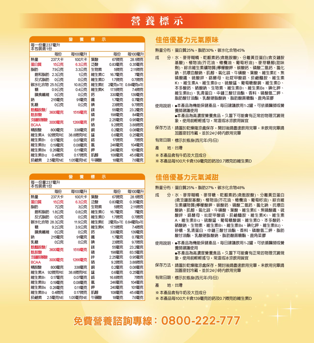減甜:水、麥芽糊精、乾酪素鈣(含麩胺酸)、植物油(芥花油、橄欖油、葡萄籽油)、難消化性麥芽糊精(專利纖維)、麥芽糖醇(甜味劑)、綜合維生素礦物質(碳酸鈣、檸檬酸鉀、磷酸二氫鈣、氯化鈉、抗壞血酸鈉、肌醇、氧化鎂、牛磺酸、葉酸、維生素E、焦磷酸鐵、硫酸鋅、鉻酵母、吡啶甲酸鉻、菸鹼醯胺、維生素K1、維生素A、維生素B12、硫酸錳、葡萄糖酸銅、維生素D、本多酸鈣、硒酸鈉、生物素、維生素B1、維生素B6、碘化鉀、維生素B2)、分離黃豆蛋白(含支鏈胺基酸)、乳清蛋白、菊糖、中鏈三酸甘油酯、香料、乳化劑(脂肪酸甘油酯、乳酸硬脂酸鈉、脂肪酸蔗糖酯)、磷酸氫二鉀、鹿角菜膠
