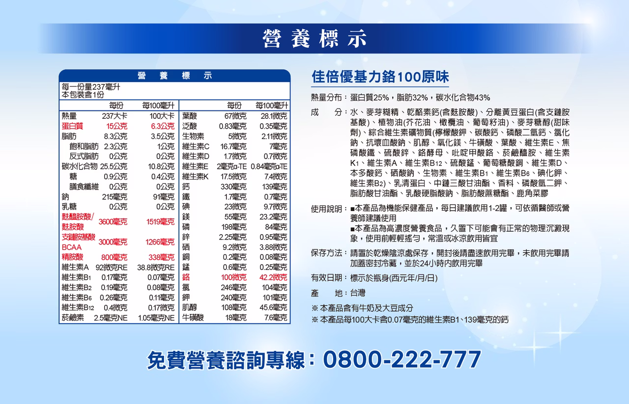 不甜:水、麥芽糊精、乾酪素鈣(含麩胺酸)、植物油(芥花油、橄欖油、葡萄籽油)、難消化性麥芽糊精(專利纖維)、麥芽糖醇(甜味劑)、綜合維生素礦物質(碳酸鈣、檸檬酸鉀、磷酸二氫鈣、氯化鈉、抗壞血酸鈉、肌醇、氧化鎂、牛磺酸、葉酸、維生素E、焦磷酸鐵、硫酸鋅、鉻酵母、吡啶甲酸鉻、菸鹼醯胺、維生素K1、維生素A、維生素B12、硫酸錳、葡萄糖酸銅、維生素D、本多酸鈣、硒酸鈉、生物素、維生素B1、維生素B6、碘化鉀、維生素B2)、分離黃豆蛋白(含支鏈胺基酸)、乳清蛋白、菊糖、中鏈三酸甘油酯、香料、乳化劑(脂肪酸甘油酯、乳酸硬脂酸鈉、脂肪酸蔗糖酯)、磷酸氫二鉀、鹿角菜膠