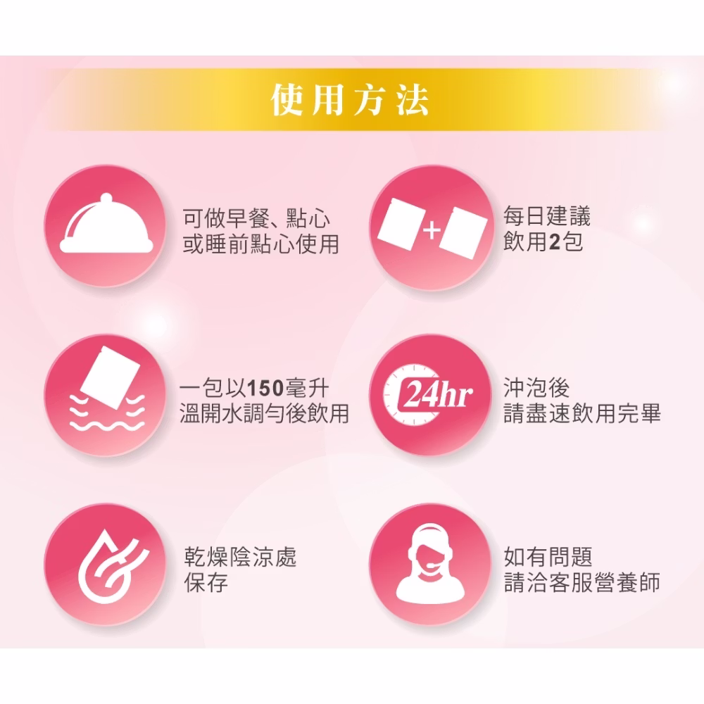 ●每包30公克,加入溫開水150c.c.調勻即可,亦可依個人喜好加減水量調成不同濃度飲用。