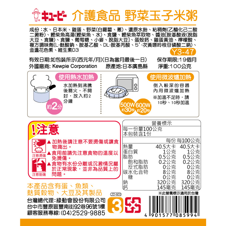 【日本kewpie介護食品】Y3-47 野菜玉子米粥-8入