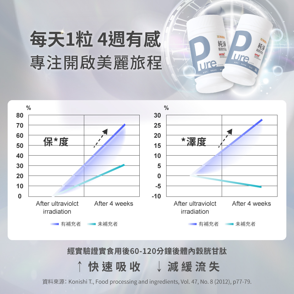 Pure穀胱甘肽原料選用「日本專利 OPITAC 穀胱甘肽」,來自日本百年大廠三菱集團,使用獨特專利技術生產,天然非基改圓酵母發酵萃取來源,純度高達98%。