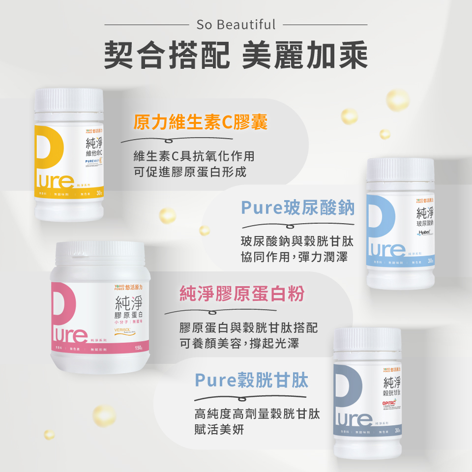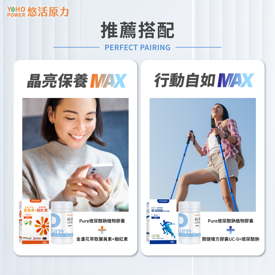 營養師推薦PURE玻尿酸鈉,可與葉黃素+蝦紅素軟膠囊、Pure膠原蛋白粉、關健複方膠囊等保健食品一起食用更加分。