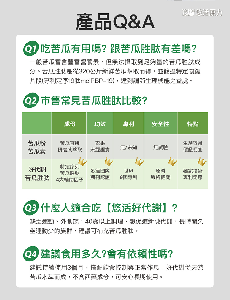 苦瓜胜肽可說是台灣人的驕傲,經多年研究發現苦瓜『第 50 到 68 的胺基酸片段』能夠調整體質、促進新陳代謝,對於缺乏運動和外食族群來說非常友善