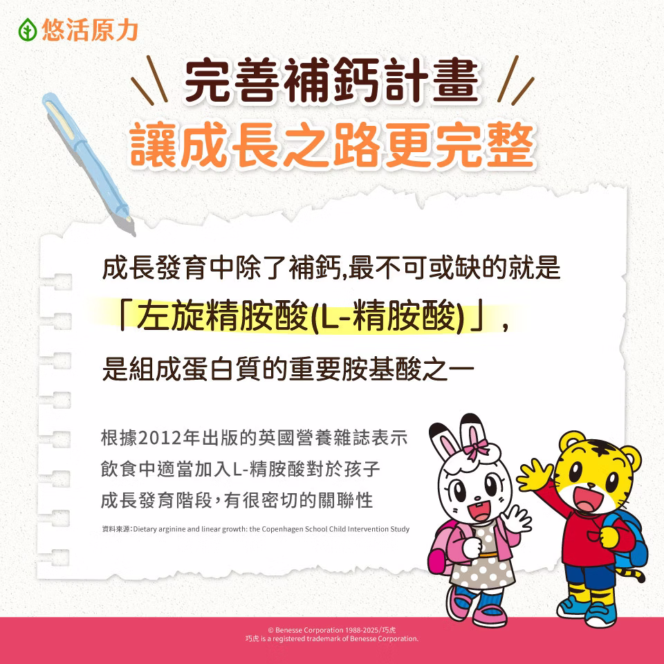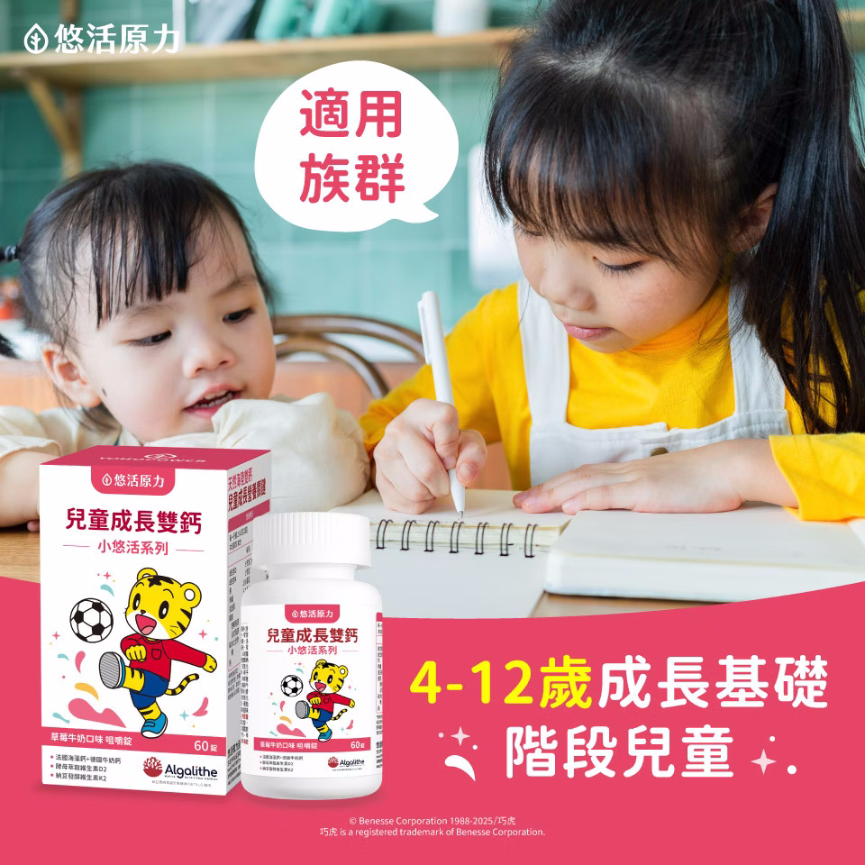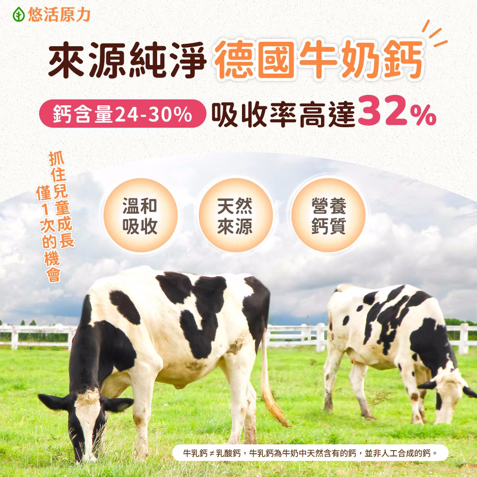 牛奶的吸收只有 30%,等於喝了一杯 300cc 的牛奶,實際吸收只有約 100cc 的鈣質,達不到每日的需求量。建議在兒童階段,就使用「小悠活兒童鈣咀嚼錠」來輔助鈣質補充。