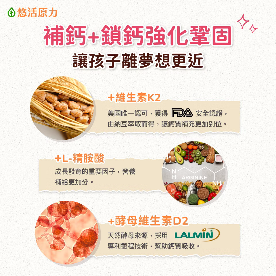 ◆ 複方成分:比起單一鈣粉,複方成分(維生素D、K2、精胺酸、鎂等)的搭配,更能讓鈣質發揮更好的作用