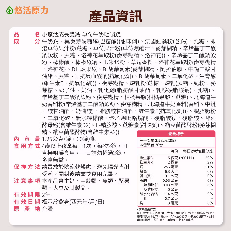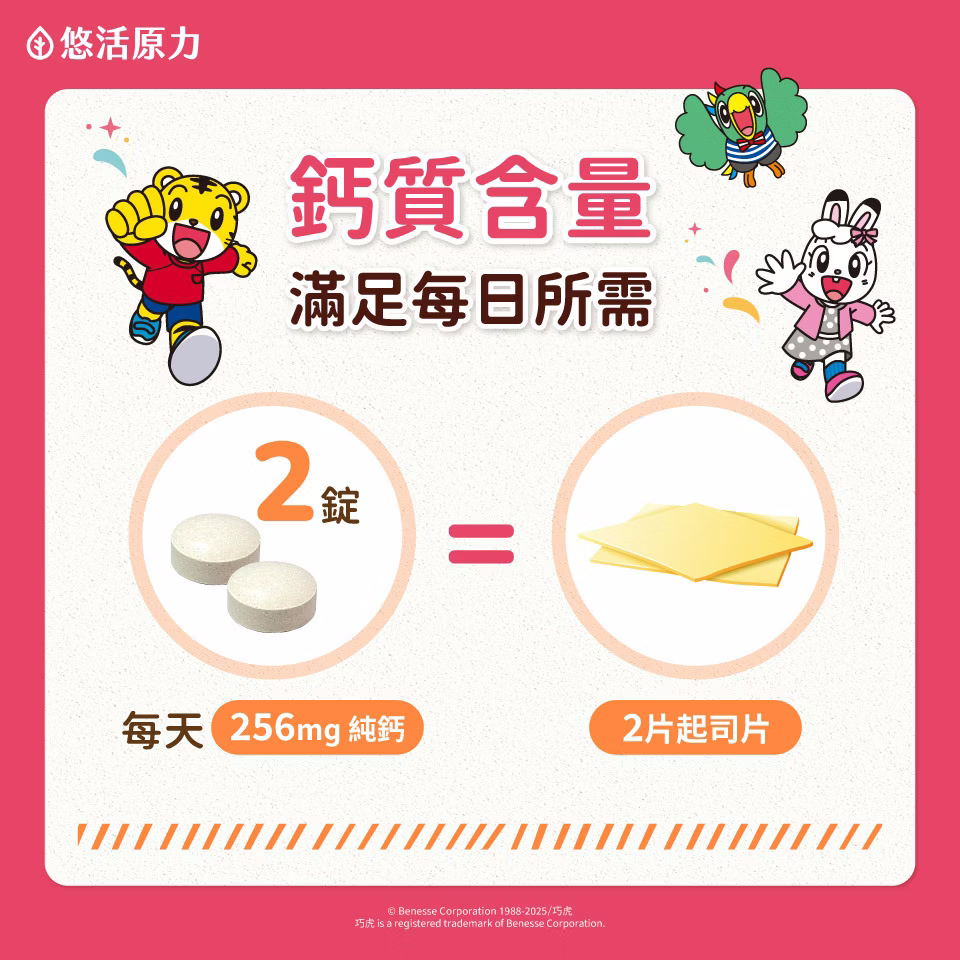 每日補充 2 錠小悠活兒童鈣咀嚼錠,就能攝取到 260mg 的鈣質,剩餘的就靠日常食物補充即可。
