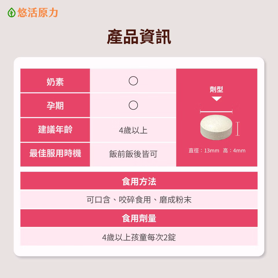 4 歲以上孩童每日 1 次,每次 2 錠,可以直接口含、咬碎食用、磨成粉末皆可,飯前飯後食用都可以。