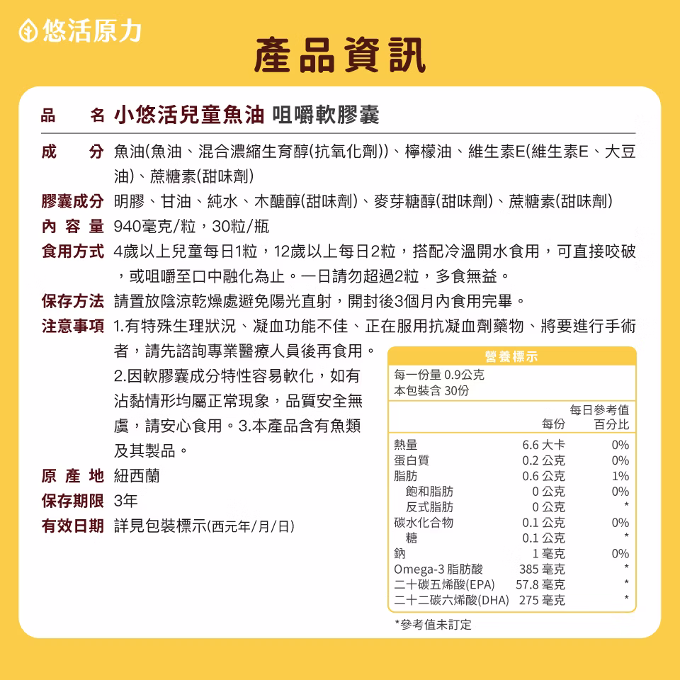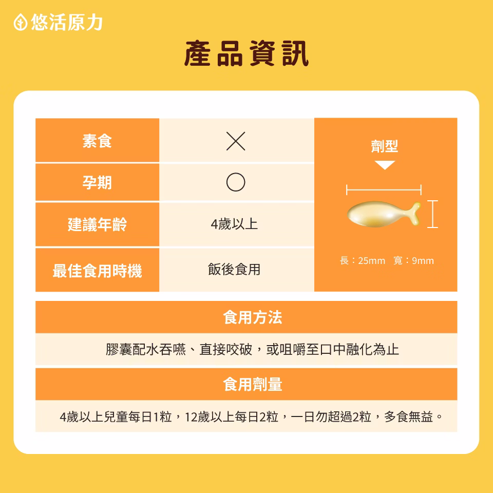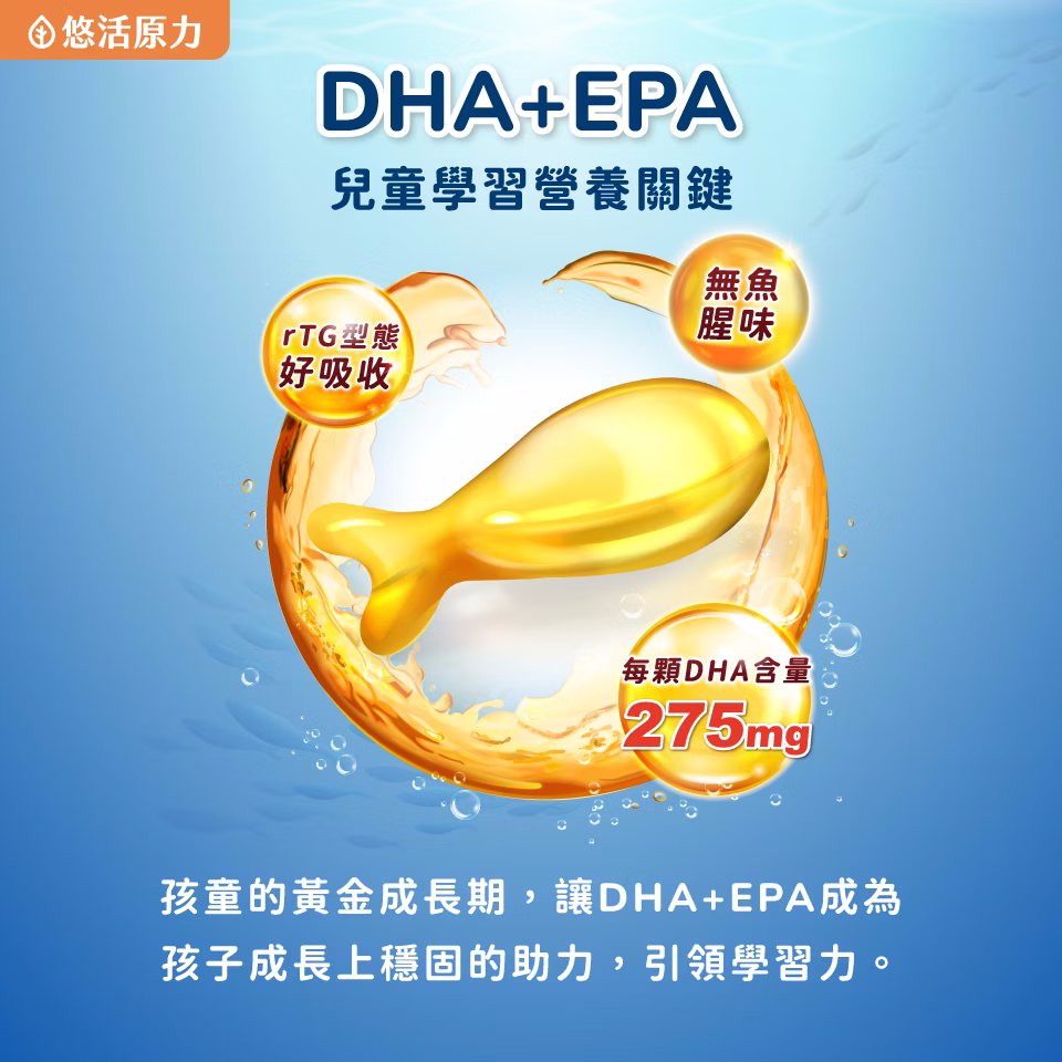 悠活原力兒童魚油含有 275mg 的 DHA 和 57.8mg 的 EPA,日常補充 1-2 顆即可滿足兒童一日所需。