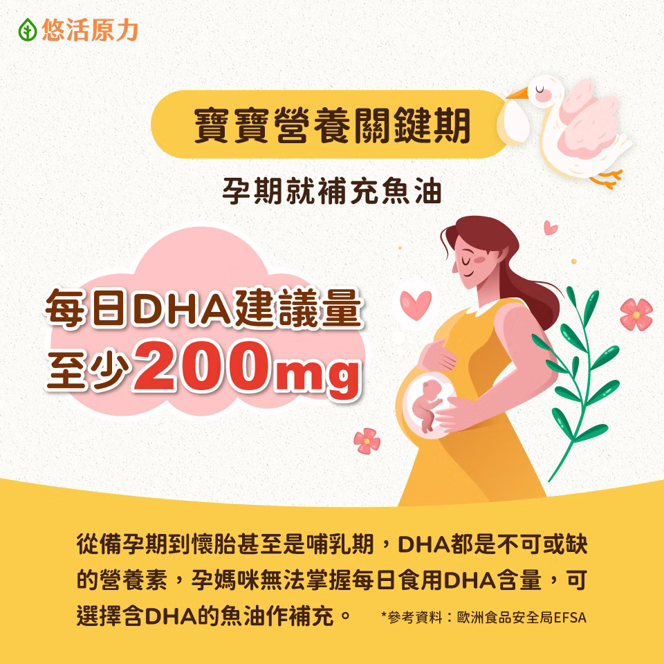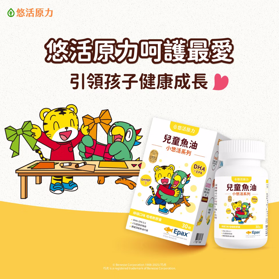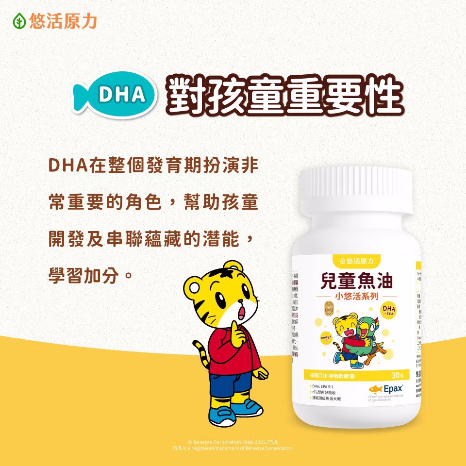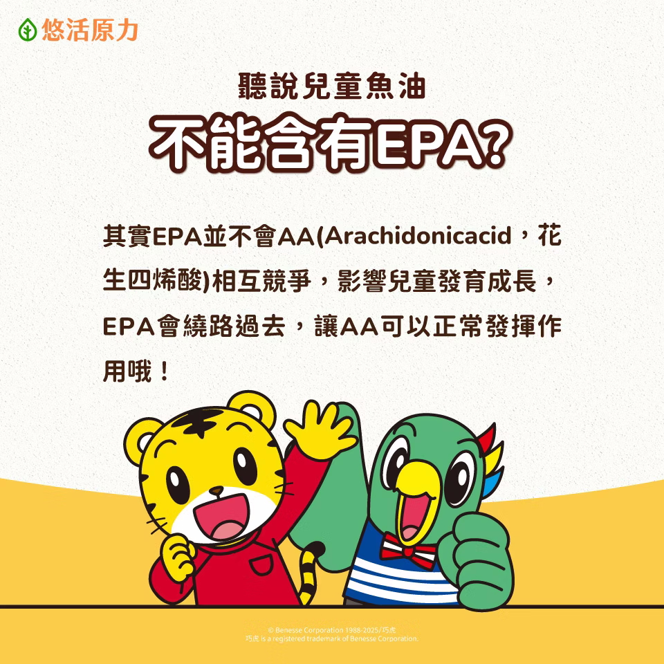 悠活原力兒童魚油含有 275mg 的 DHA 和 57.8mg 的 EPA,日常補充 1-2 顆即可滿足兒童一日所需。