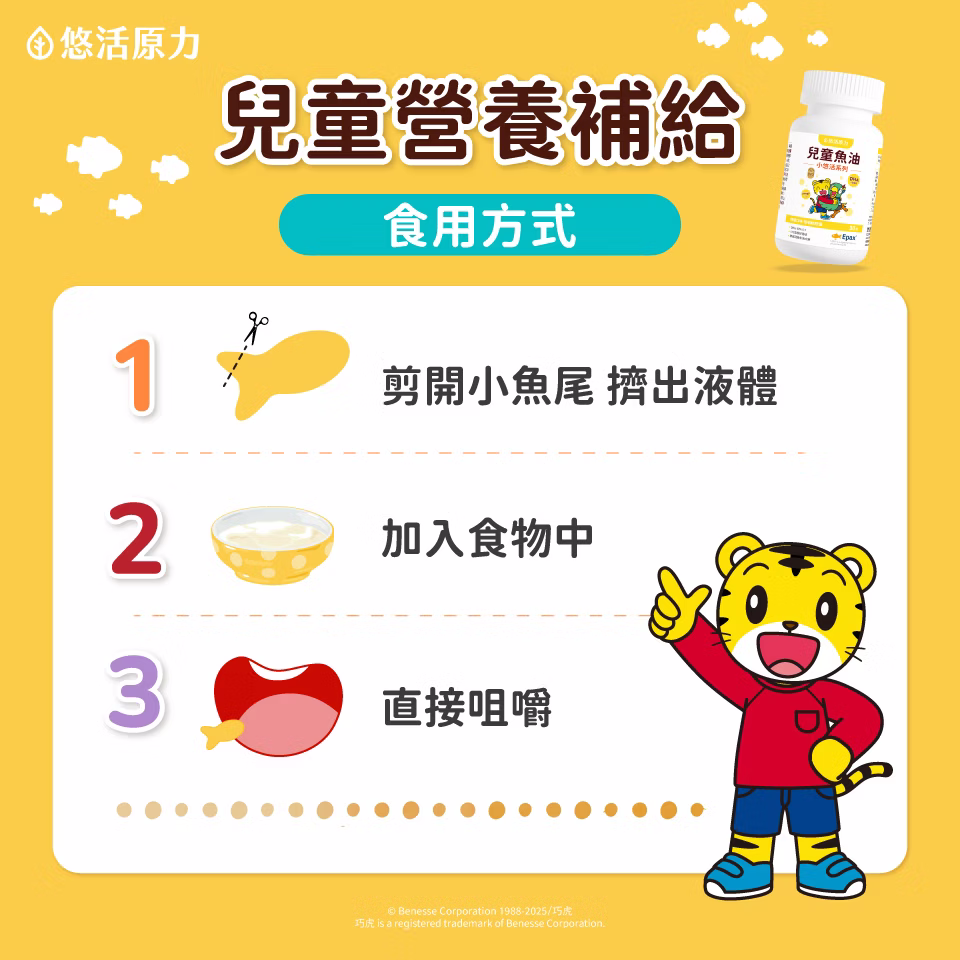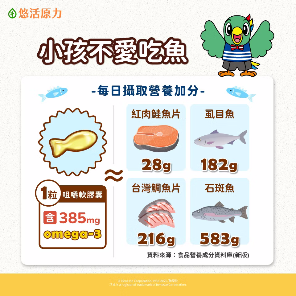 而且建議除了吃魚之外,還是可以補充兒童魚油,以此來輔助孩子滿足一日 Omega-3 所需。