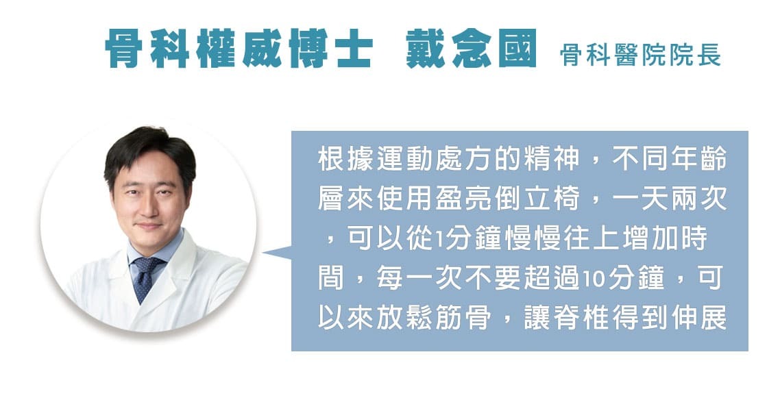 讓使用者能先坐著,躺著,再倒立。循序漸進的方式,除了能降低直接「倒立」的恐懼,在倒立動作結束後,因倒立產生的呼吸急促及頭暈目眩感,在回復坐姿時也能得到安全休息。簡而言之,倒立椅能讓使用者在倒立前後,都感到安全且安心。這也是盈亮倒立椅獲得前榮民總醫院副院長徐弘醫師推薦的主因。